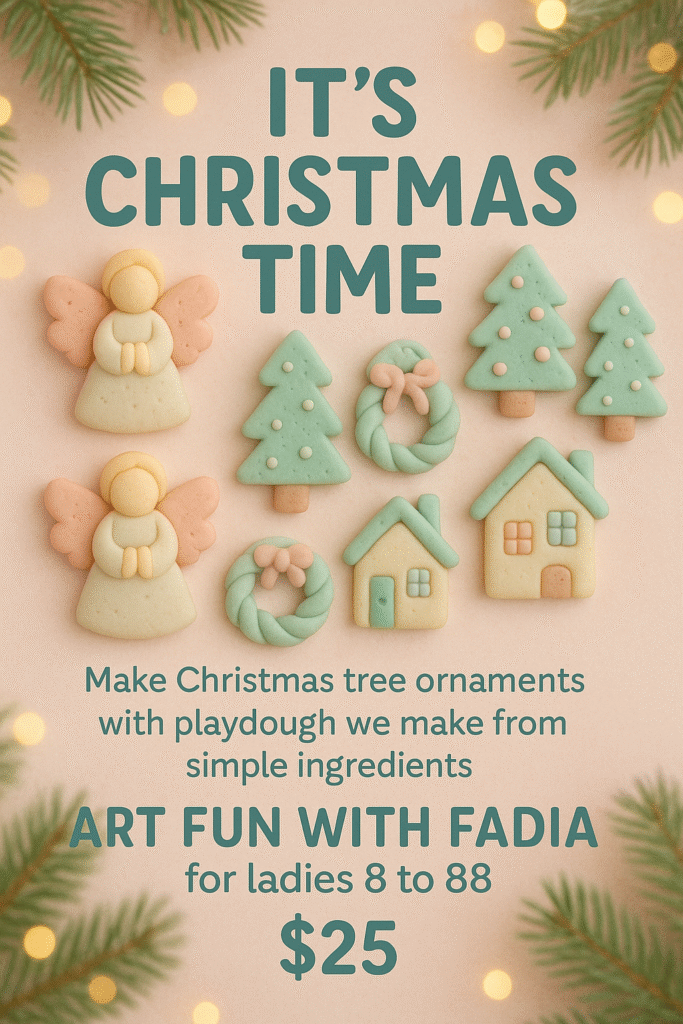 The holidays are just around the corner — the perfect moment to start preparing your home for the season of joy! Join our Art Fun with Fadia session, where we’ll craft beautiful Christmas tree ornaments from playdough made with simple ingredients. Handmade ornaments bring a special warmth and character to your home — each one telling its own story. Come enjoy a cozy, creative evening surrounded by festive cheer, laughter, and community spirit.